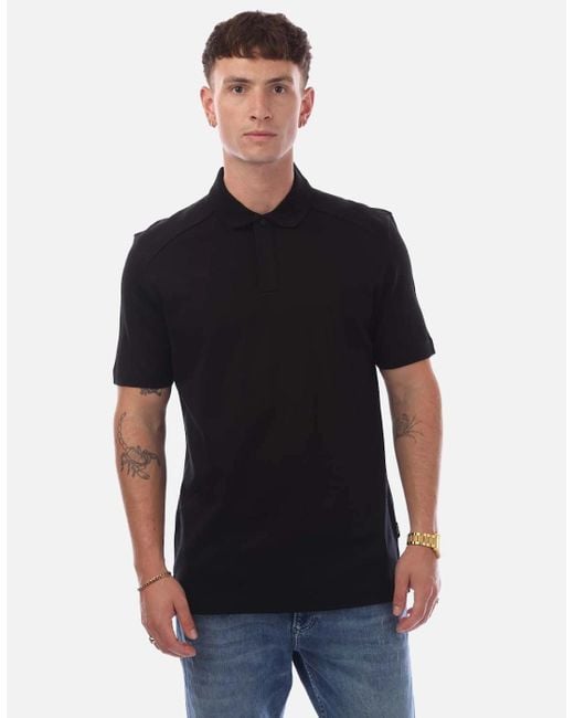 Mens Boss Parlay 207 Polo Shirt - Ribbed collar. - Short sleeves. - Two press stud fastening covered placket. - Plain design shoulder panels. - BOSS logo tag to the waist. - Constructed from a ripstop mercerised cotton. - Regular fit. - 95% Cotton 5% Elastane. - Ref: 50520242001, Material: Cotton Blend. Colour: black