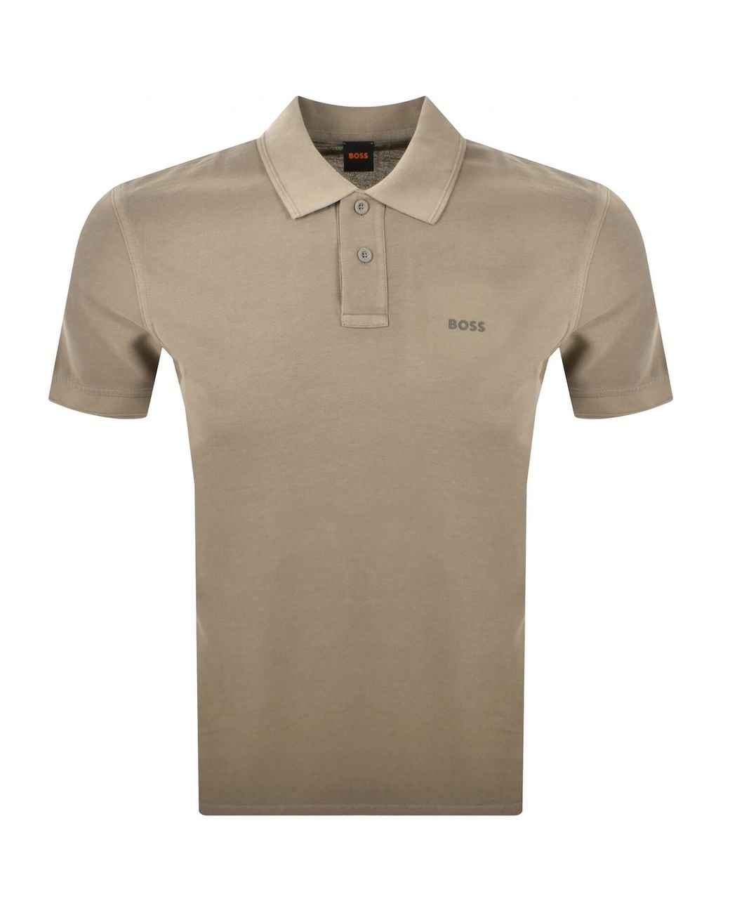 BOSS Casual Prime Polo T Shirt In Brown. A branded two button fastening at the neck with a ribbed design to the polo collar and cuffs on the short sleeves which both feature an embossed tipping design. The signature BOSS logo is raised on the left of the chest in a rubberised design. 100% Cotton. Colour: natural
