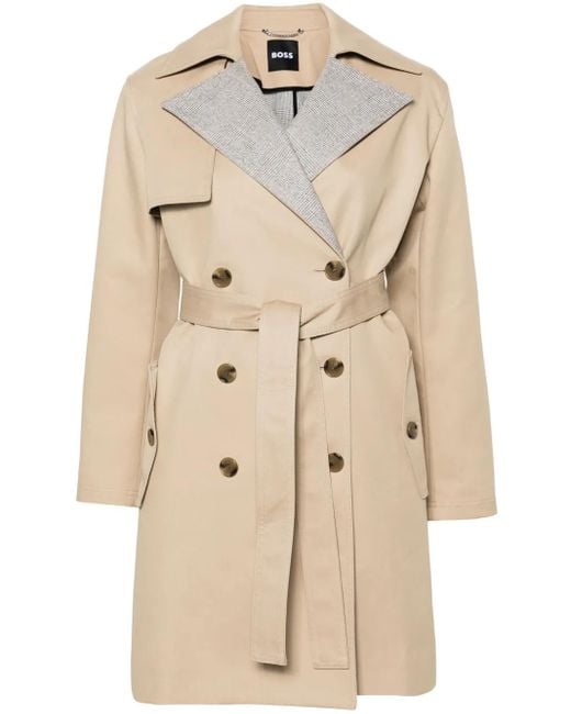 beige cotton twill weave double-breasted button fastening notched lapels long sleeves storm flap belt loops detachable belt two side button-fastening pockets Prince of Wales check pattern lining straight hem above-knee length Size: 34. Gender: Female. Material:Cotton.
