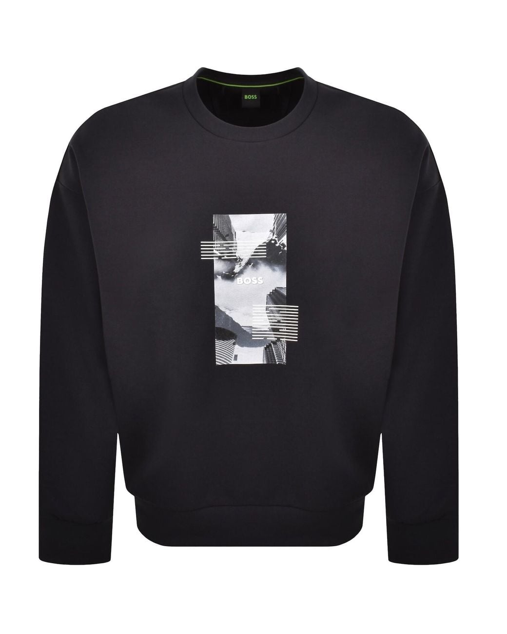 BOSS Stenson Zone Sweatshirt In Navy Oversized Fit. Ribbed design to the crew neck cuffs on the long sleeves and waistband. A graphic design with the BOSS logo is printed and raised on the chest. 62% Cotton 33% Polyester And 5% Elastane. Colour: blue