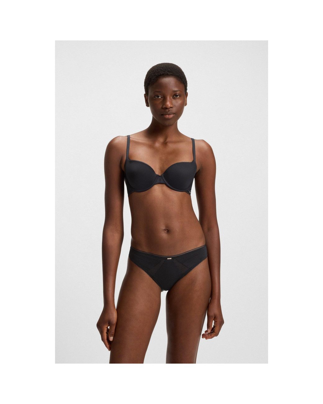 Featuring beautiful lace inserts and picot trims, this BOSS Womenswear underwire bra is a luxurious option for everyday wear. Breathable microfibre. Gold-tone logo. Colour: black