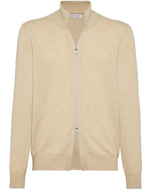 Light beige cashmere fine knit front two-way zip fastening ribbed trim high neck long sleeves Size: 44. Gender: Male. Material:Cashmere. Colour: natural
