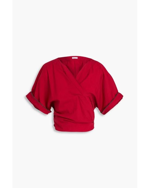 Women's Red Cropped Bead-Embellished Cotton-Blend Wrap Top