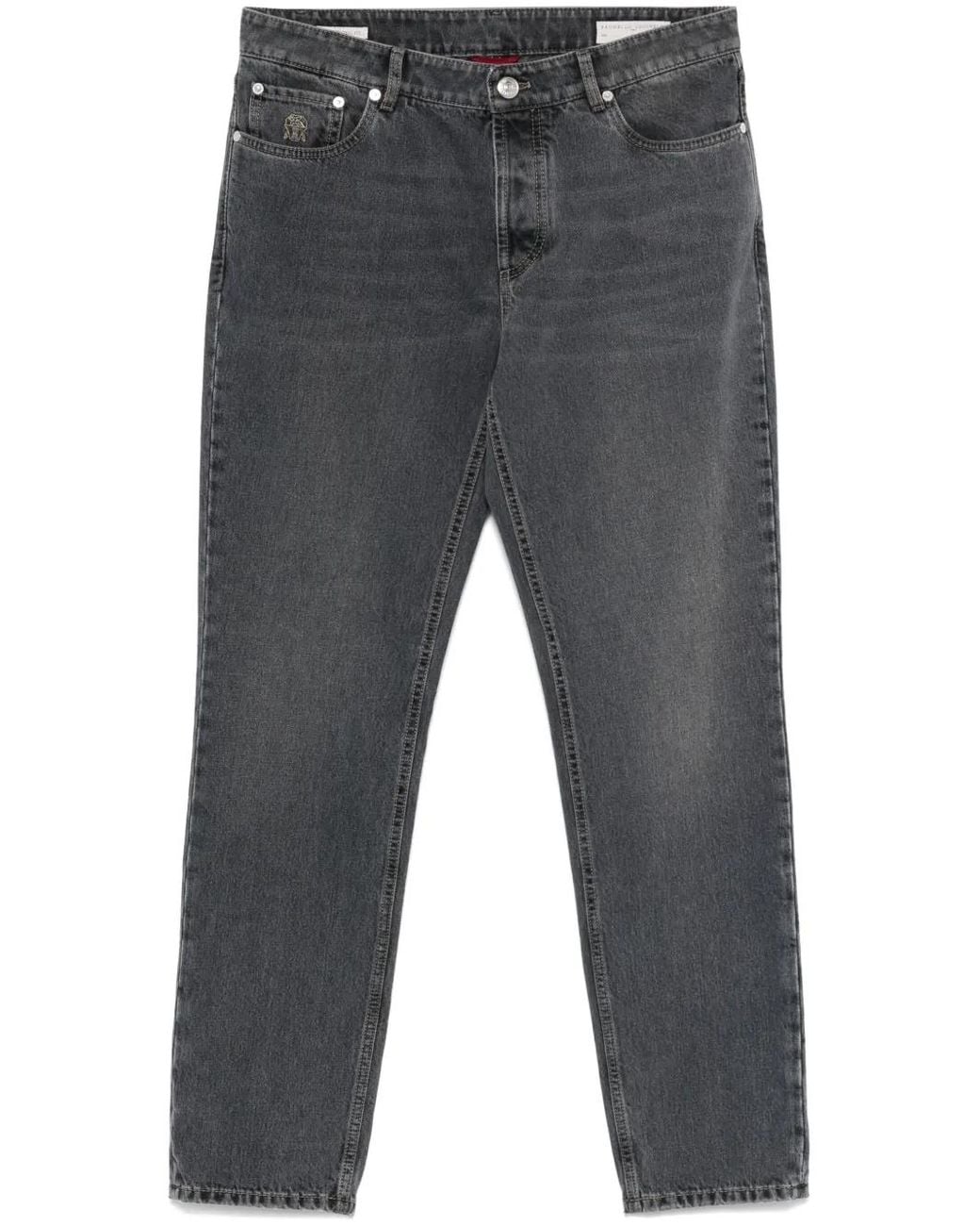 Medium grey concealed fly and button fastening belt loops classic five pockets logo patch to the rear Size: 48. Gender: Male. Material:Calf Suede/Cotton.