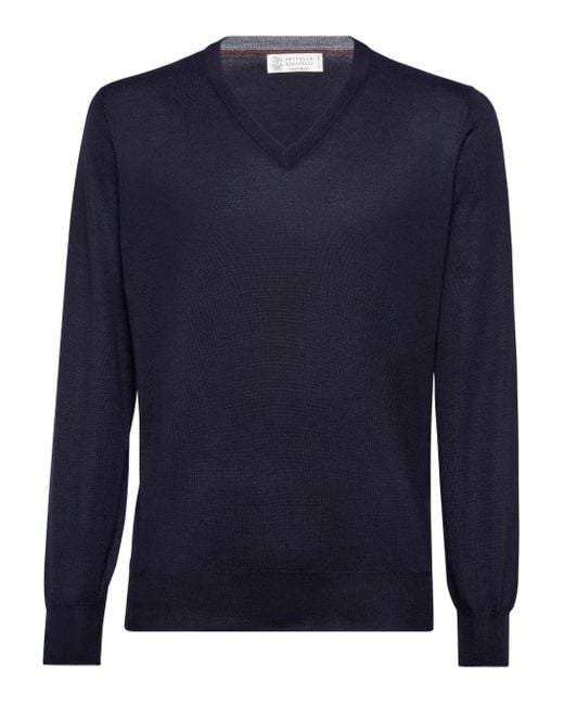 Expertly crafted in Italy from pure cotton, this slim-fit navy blue jumper from Brunello Cucinelli (Vip) features a ribbed v-neck, long sleeves and a ribbed hem and cuffs. Size: 60. Gender: Male. Material:Cashmere/Silk. Colour: blue