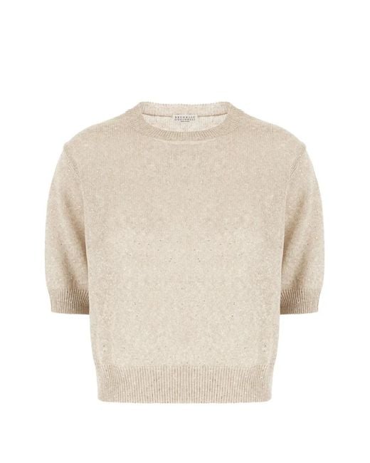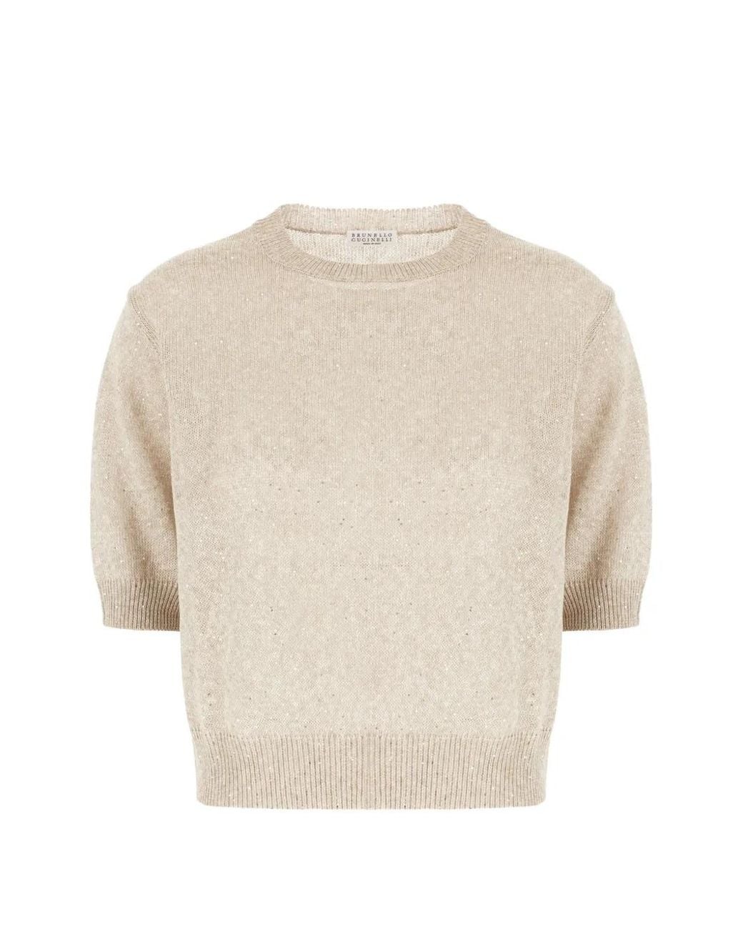 Beige sequin embellishment round neck ribbed hem short sleeves Size: L. Gender: Female. Material:Linen/Flax/Cotton. Colour: natural