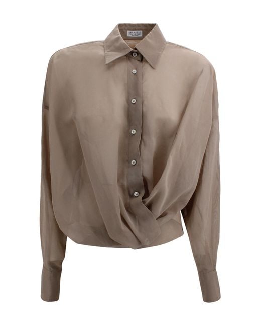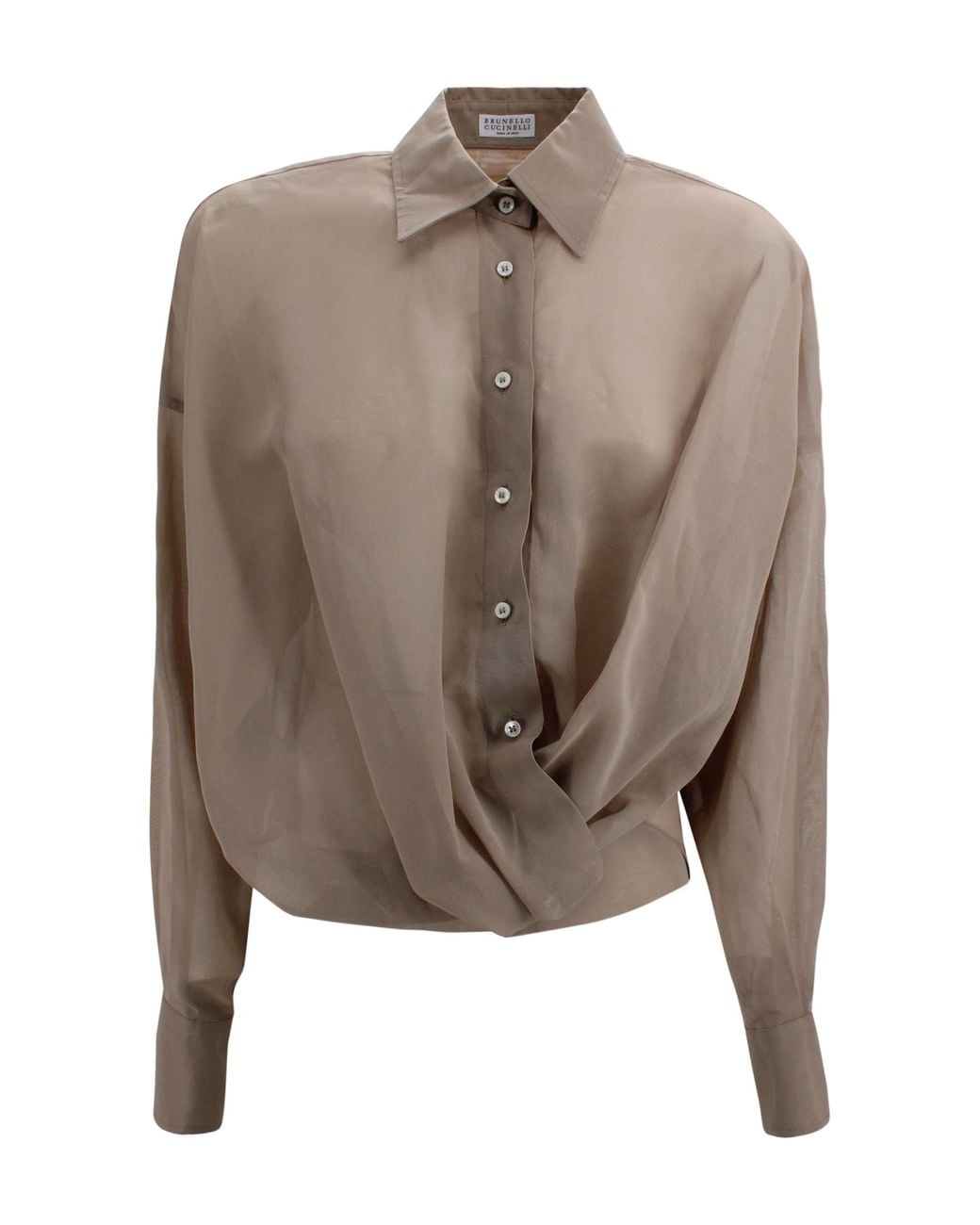 Silk shirt crafted from sheer fabric, featuring a ruched detail and long sleeves for an elegant, feminine design. The style includes a classic collar and front button closure, perfect to pair with trousers or skirts for sophisticated, modern looks. Features Fabric: sheer silk Long sleeves Ruched detail Classic collar Front button closure Comfortable fitComposition: 100% Silk