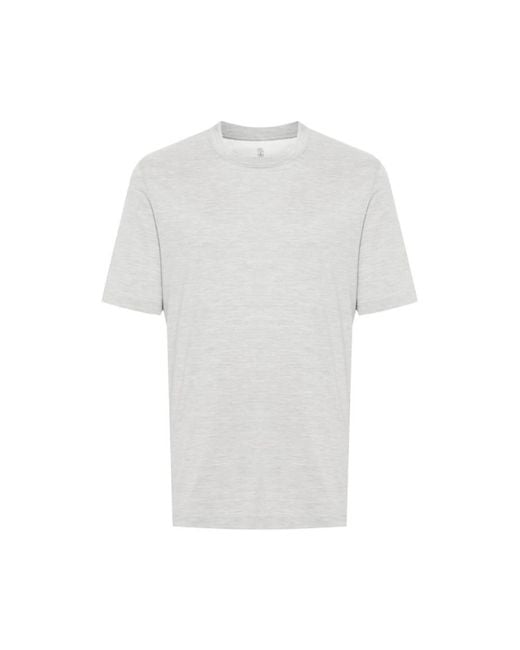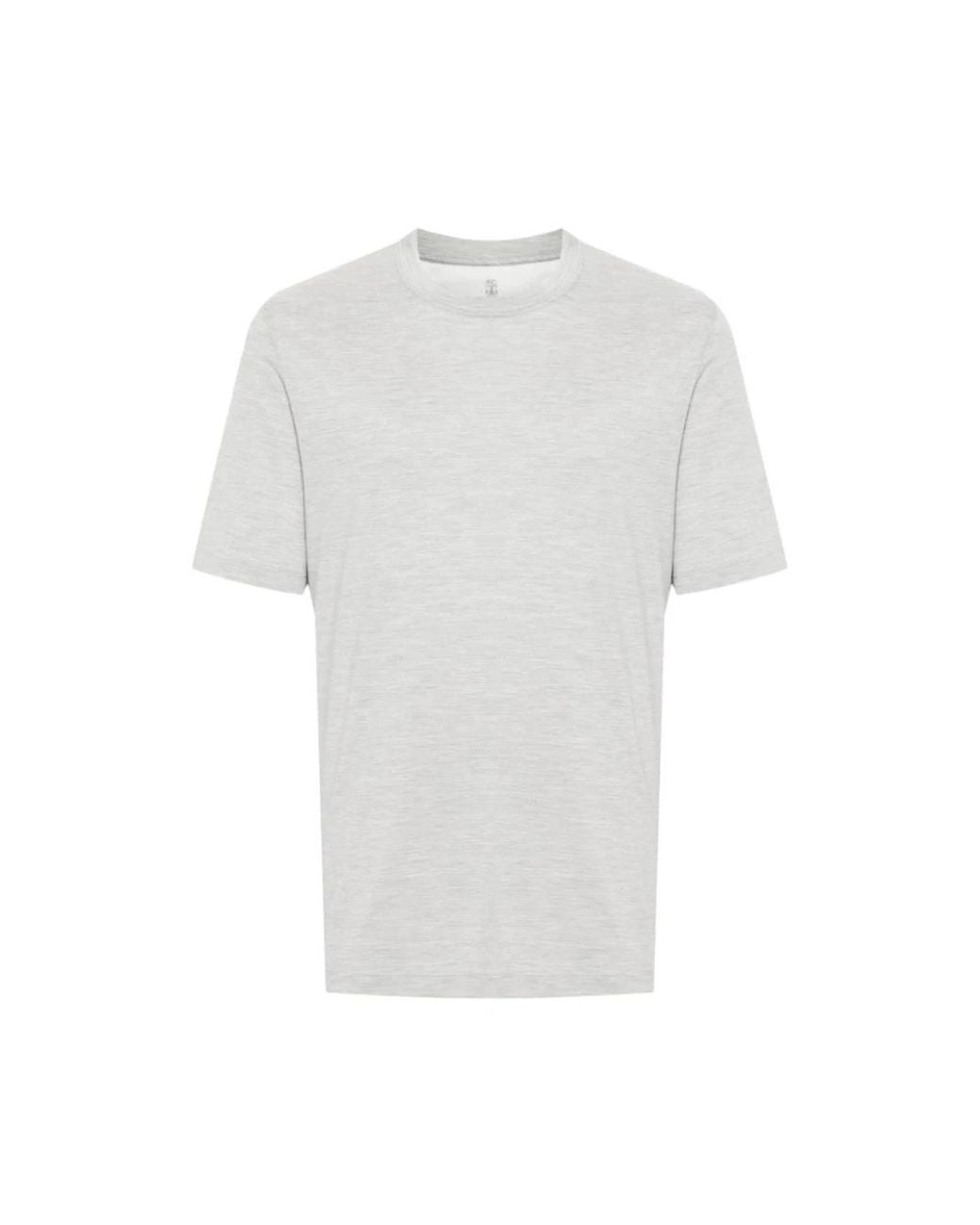 Elevate your casual wardrobe with the Mélange-effect Crew Neck T-shirt from Brunello Cucinelli. This light grey silk-cotton blend t-shirt combines jersey texture with a sophisticated mélange effect, perfect for everyday wear. Key attributes: Grey | Silk | Cotton | Crew neck | Short sleeves | Straight hem | Dimensions & fit: Regular fit | Composition & care: 62% Silk | 38% Cotton | Not specified Colour: white