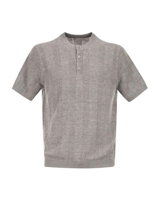 Men's Grey Textured Rib Knit T-Shirt With Henley Collar