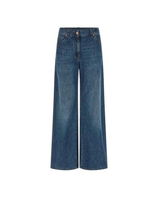 Brunello Cucinelli Monile Jeans are light stonewashed cotton denim featuring signature monile detailing and contrast stitching. They offer a relaxed, baggy silhouette for casual, everyday wear. Key attributes: Blue | Cotton | Front zip and button closure | Five pockets | Light stonewashed denim | Contrast stitching | Monile detail | Leather logo label at back | Dimensions & fit: Baggy fit | Wide leg Colour: blue
