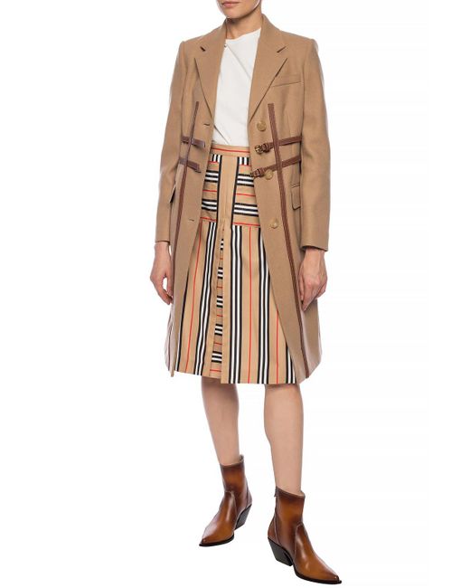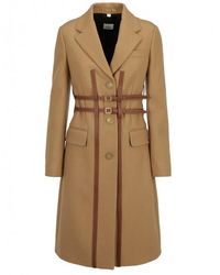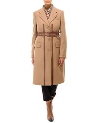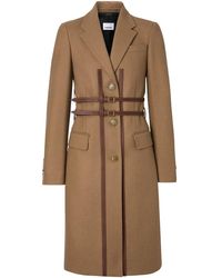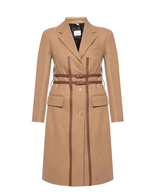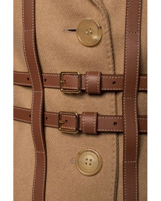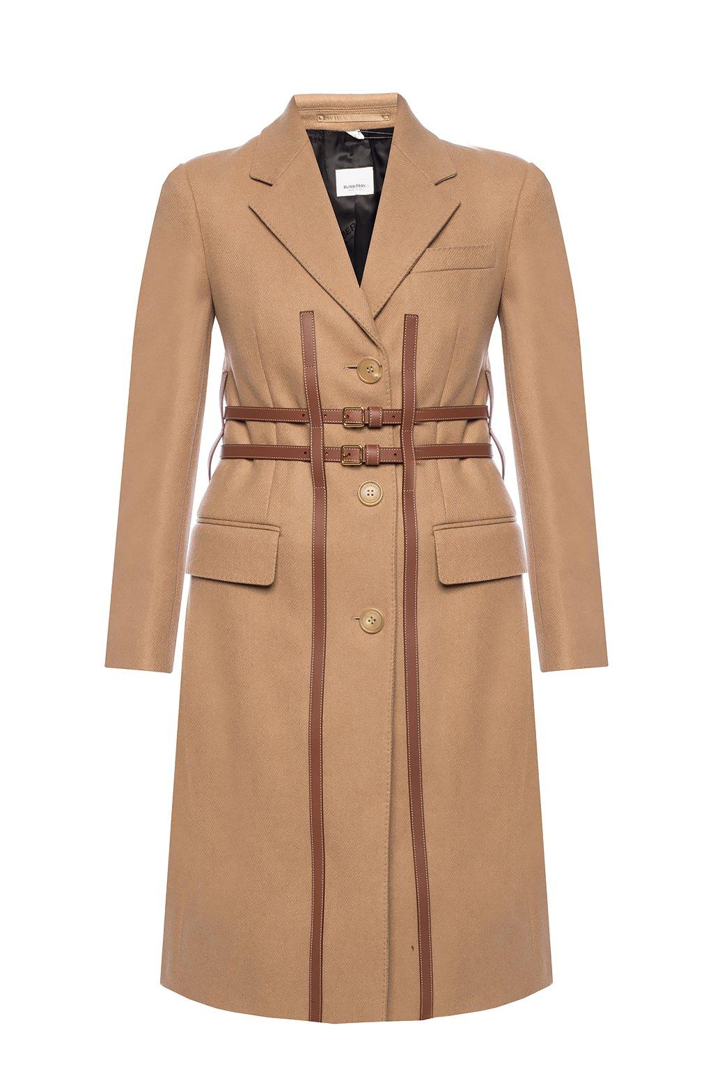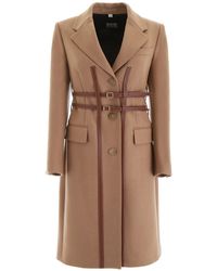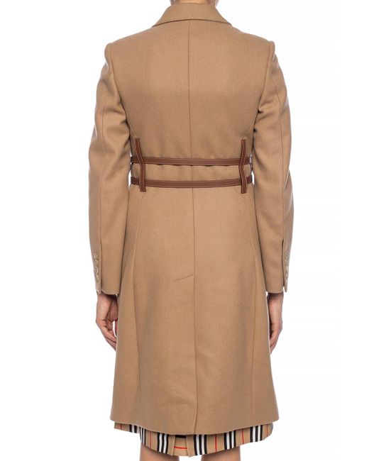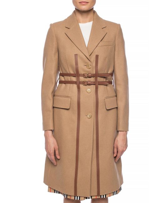 Brown 'Callington' coat with notch lapels from Burberry. Made of wool. Fastened with buttons and buckle straps. Two flap pockets and a slip pocket on the front. Single rear vent. Wool. Leather. Model's Measurements. Height: 176cm. Bust: 85cm. Waist: 60cm. Hips: 89cm. Colour: natural