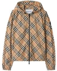 Go to ItalistCheck hooded jacket by Burberry London.Featuring:Drawstring hoodZip closureLong sleeves with elasticated cuffsSide zip pocketsAppliquéd Equestrian Knight Design at sleeveDrawstring hemRegular fitModel is 1,70 m and wears size SGender: WomenMaterial: 100% POLYESTERColor: SAND IP