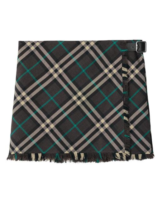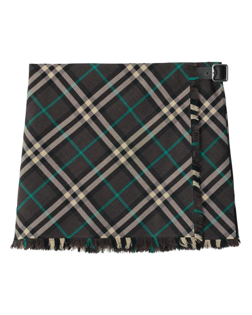 Dark grey/sand beige leather fully pleated check pattern frayed edge side buckle fastening thigh-length Size: 6. Gender: Female. Material:Wool/Polyester/Leather/Mother of Pearl. Colour: brown