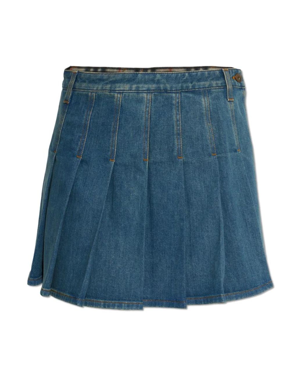 Burberry Denim Skirt Dahlia pairs wide pleating with a navy denim wash for a refined, city-ready silhouette. Distinctive details — a signature metal button and contrasting brown stitching — give the skirt a tailored, elevated finish. Key attributes: Blue | Navy blue | Denim | Waistband with belt loops | Metal button closure | Wide pleats | Short, slightly flared silhouette | Contrasting brown stitching | Subtle wash finish | Designer signature button | Dimensions & fit: Model height: 177cm | Model bust: 83cm | Model waist: 61cm | Model hips: 89cm | Model is wearing size: 8 | Short, slightly flared fit Colour: blue