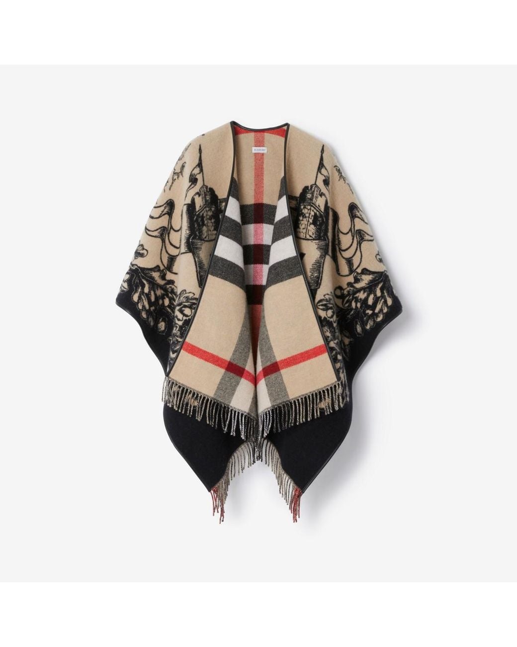An Italian-made cape in jacquard-woven wool, reversing from our Equestrian Knight design to Burberry Check. The style is trimmed with supple leather. Fringing at both ends Colour: multicolour