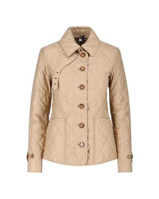 Burberry 'Fernleigh' beige fabric jacket with quilted and padded design, collar with adjustable strap, button closure and adjustable front tab, two side pockets, button cuffs, inner Check pattern, straight hem.