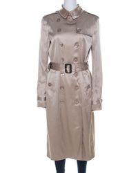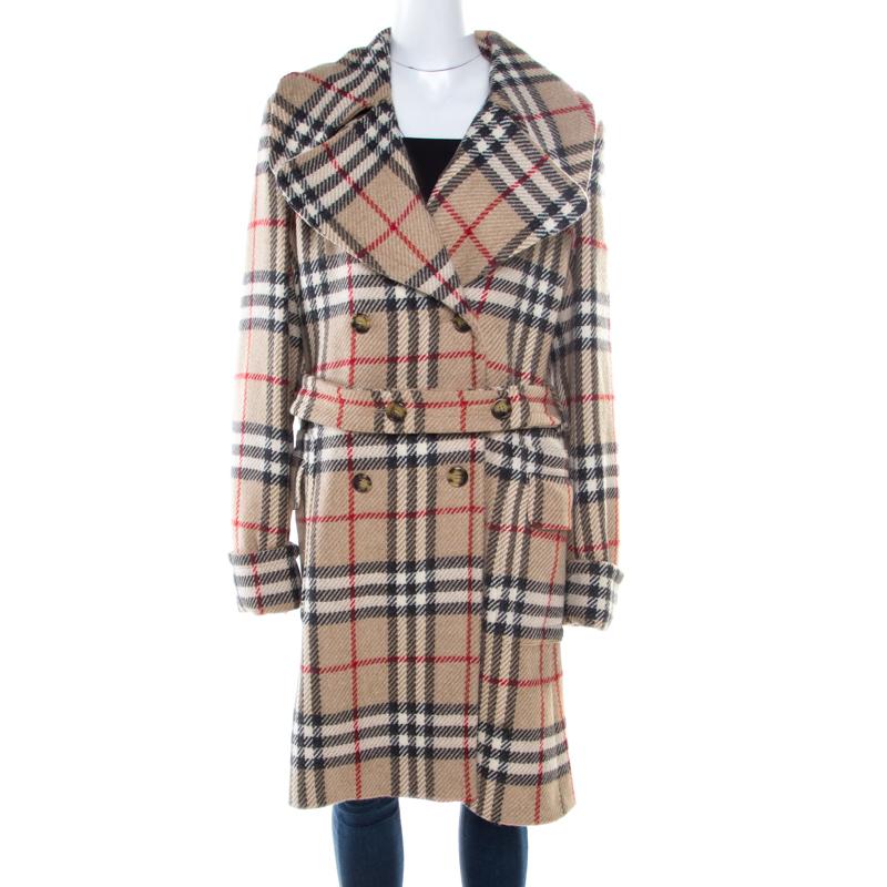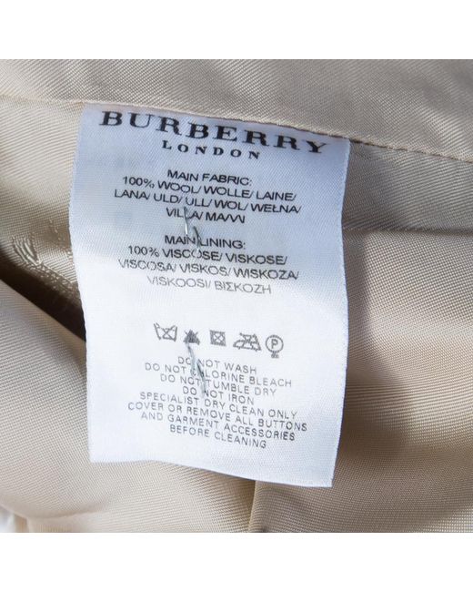 To warm all your chilly days with high-fashion, Burberry London brings you this fabulous overcoat. Made from wool, it features a double-breasted design, the signature check all over, wide lapels and a belt. The coat has a luxurious feel and we are certain you will love owning it. Includes: The Luxury Wardrobe Packaging, Extra Button. Fabric: Shell: 100% Wool ( Lining: 100% Viscose ). Accessories: Belt. Occasion: Evening. Closure: Buttoned. External Pockets: 2. Condition: Gently Used. This item is in good condition with slight pilling on the main fabric. There is a separate pouch with an additional button attached to the main label.. Colour: natural
