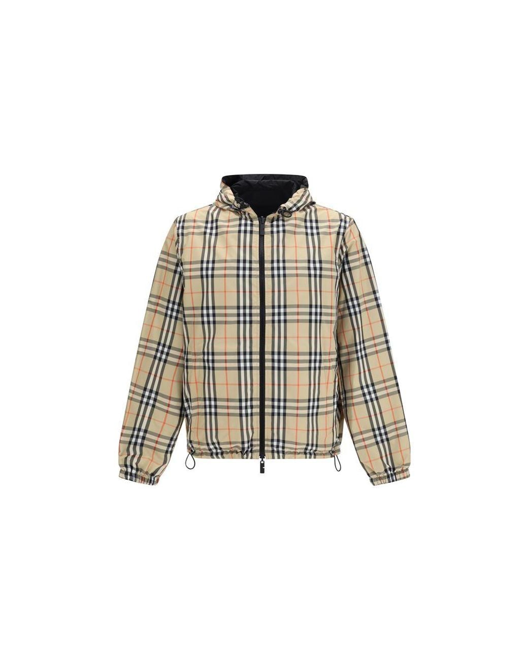 The Reversible Vintage Check Jacket by Burberry features the iconic Vintage Check pattern and a front logo appliqué. Equipped with a drawstring hood, front zip closure, two side patch pockets, and long sleeves, it combines iconic style and functionality in a versatile, contemporary piece. Season: SS26Fit: RegularComposition: 100% Polyester. Colour: natural