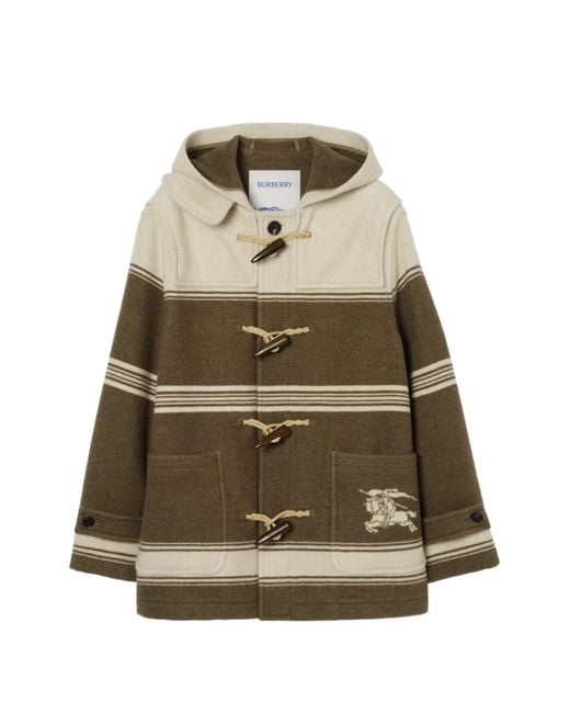 Neutral and brown striped design hood side patch pockets button-tab cuffs button and toggle closure Size: 50. Gender: Male. Material:Wool/Polyamide/Cotton. Colour: natural