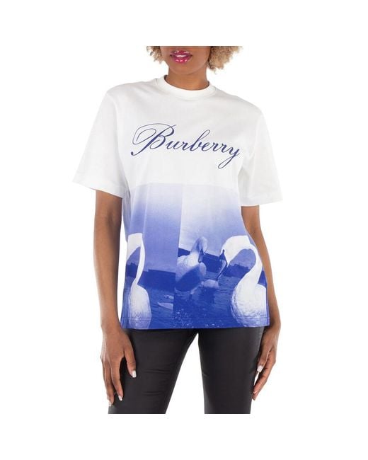Burberry Ladies Tops. Fashion category: T-Shirts & Henleys. SKU: 8077611. Material: Cotton;Polyamide. Burberry Swan Graphic T-Shirt. This graphic T-shirt features a swan design, It is machine washable and is made from 100% cotton, with trim consisting of 94% cotton, 3% polyamide, and 3% elastane. Made in Portugal. Colour: blue