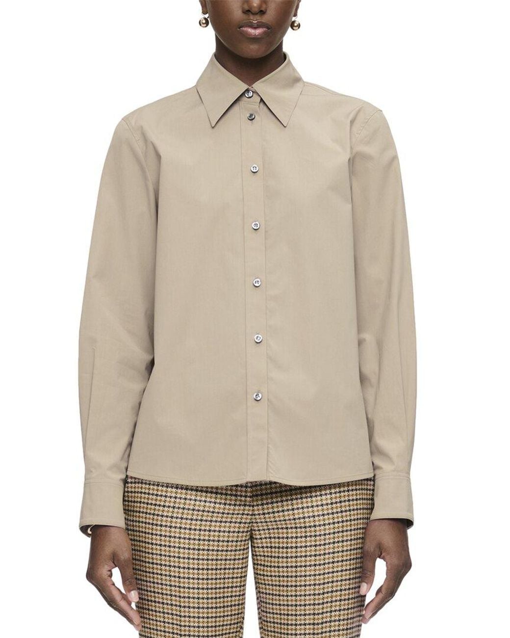 Please note: Size selections are European. For US conversions, please reference the size chart. Color/pattern: khaki Approximately 26in from shoulder to hem Design details: tailored shirt, hip length and point collar Button front 96% Cotton, 4% Elastane Dry clean only Made in Italy. Colour: natural