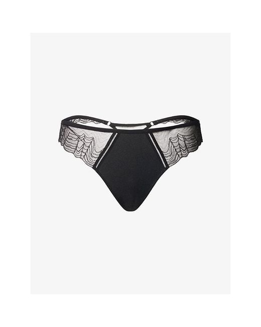 Calvin Klein stretch-woven thong83% nylon, 17% elastane; contrast 100% polyesterMid-rise, elasticated waistband, lace embroidery panels at front, brand plaque at back, all-over crepe texture, lined at gusset, slight coverage at backMachine wash at 30°CTrue to sizeModel is 5ft 10in/1.78m and wears a size smallLightweight, stretchyFor hygiene reasons, we are unable to exchange or refund this product, unless faulty. Colour: black