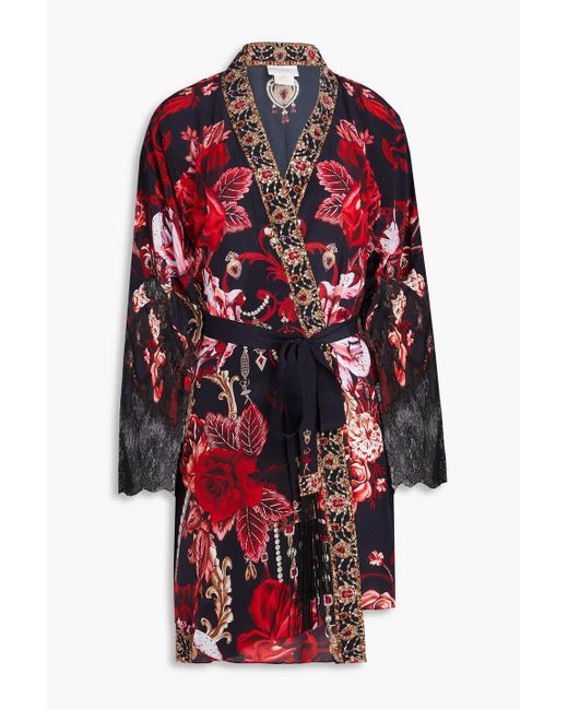 Women's Red Crystal-Embellished Lace-Trimmed Floral-Print Silk Crepe De Chine Coverup