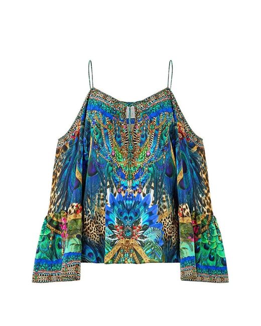 Women's Blue Haut Imprimé À Épaules Tombantes