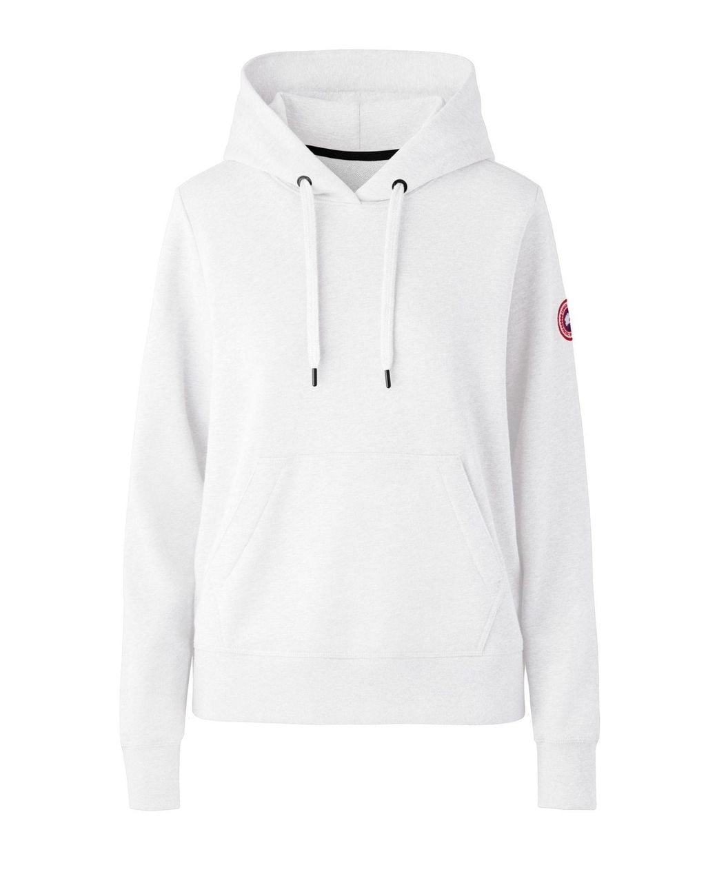 Adjustable hood with external drawcord, ribbed knit hem and cuffs, kangaroo pockets, and logo embroidered on the left sleeve. Colour: white