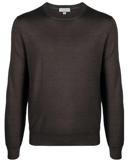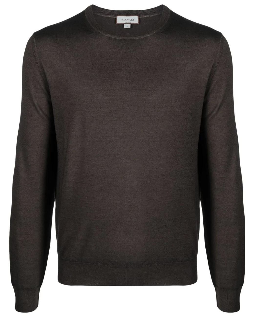Coffee brown wool-silk blend fine knit crew neck long sleeves ribbed cuffs and hem Size: 56. Gender: Male. Material:Silk/Wool. Colour: black