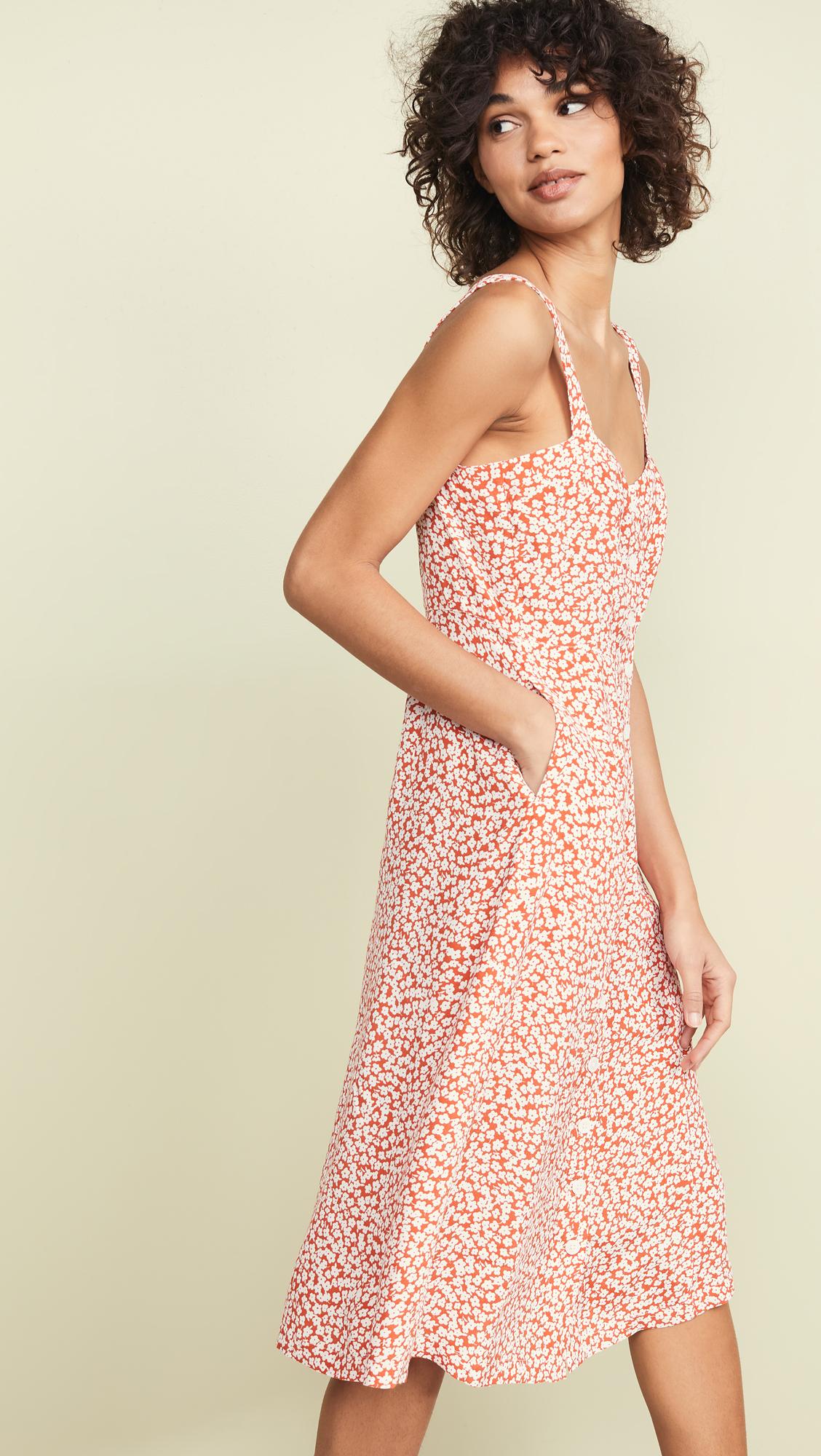 Fabric: Lightweight slinky weave. Ditsy print. Midi length. Button at front. On-seam hip pockets. Shell: 55% viscose/45% rayon. Unlined. Dry clean. Style #CAPUL30194. Length: 44in / 112cm, from shoulder.