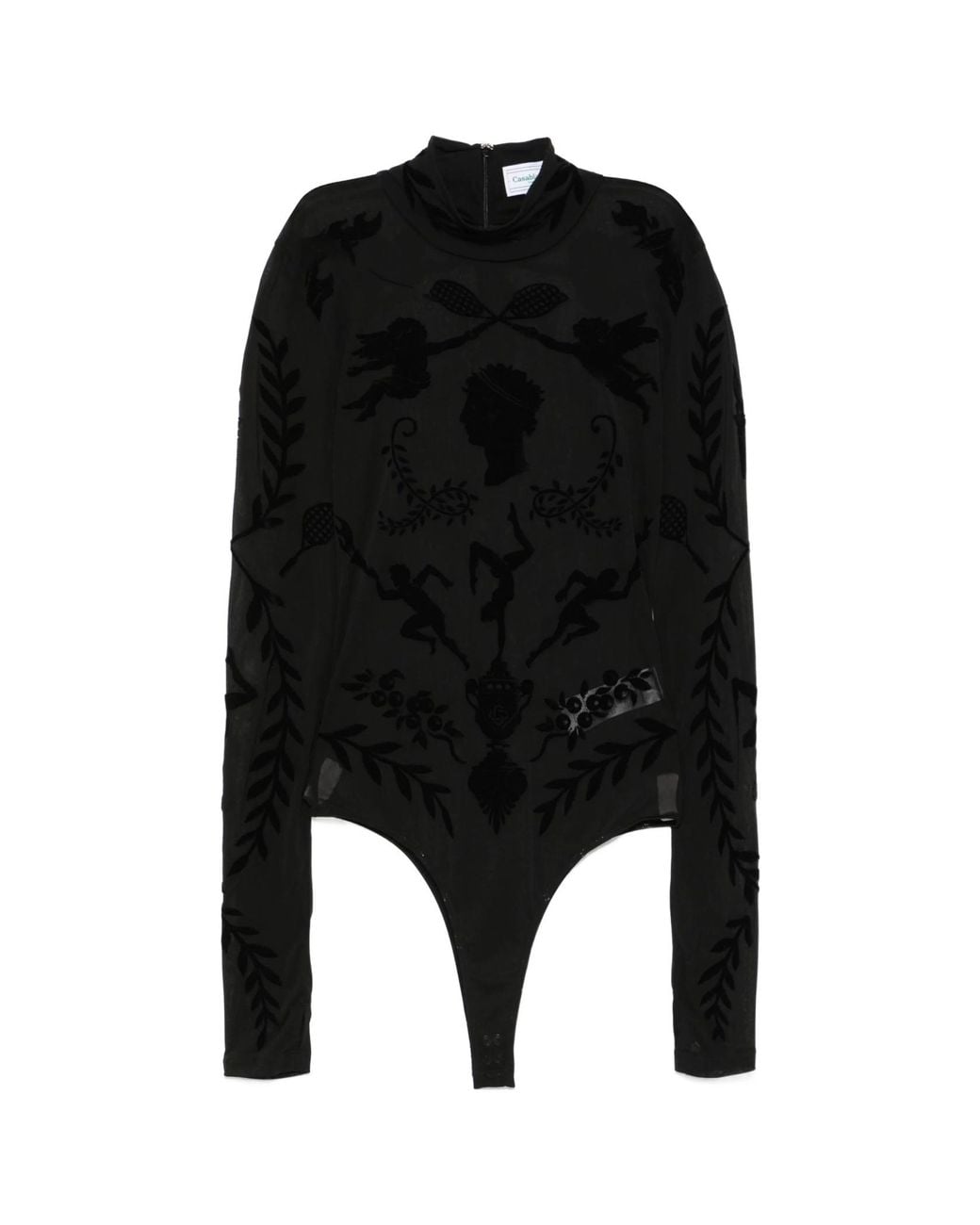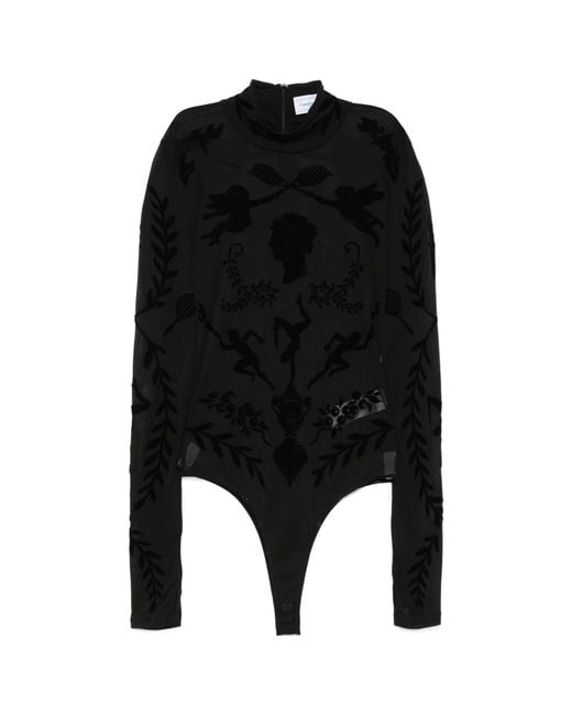 Hidden hook fastener zipper opening and closing on the back, hidden hook fastener, large area pattern printing, high collar, long sleeves. Colour: black