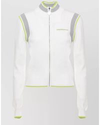 Go to The Fashion SquareHigh neck | All-over perforated pattern | Perforated design | Blue striped detail | Ribbed cuffs | Ribbed hem | Front logo patch | Front zip fastening | Zip closure Colour: blue