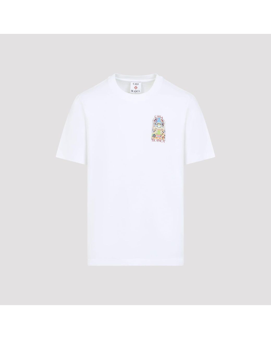 Casablanca Orchid Court White Cotton T-shirt. Crafted from white cotton jersey, featuring a round ribbed neckline, logo and graphic on the chest and on the back, short sleeves, and a straight hem. Material: 100%ORGANIC COTTON. Made in: Portugal. Colour: white