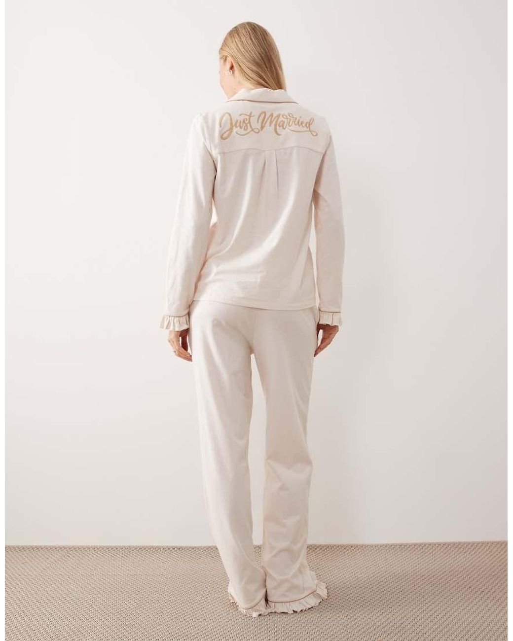 Women's Natural Bridal 'Just Married' Revere Nightwer Set With Ruffle Hem And Cuff