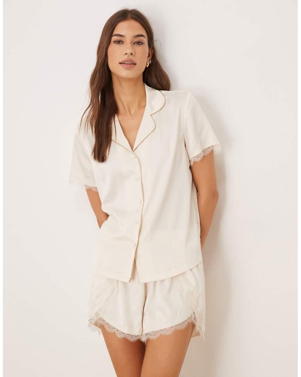 - Bridal Satin Button Up Lace Cuff Short Nightwear Set