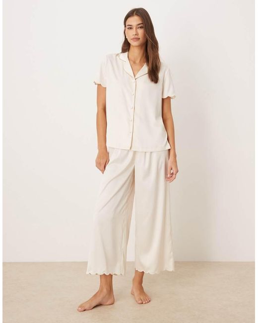 Women's Natural Bridal Scallop Placket Buttom Up Capri Length Bottom Nightwear Set