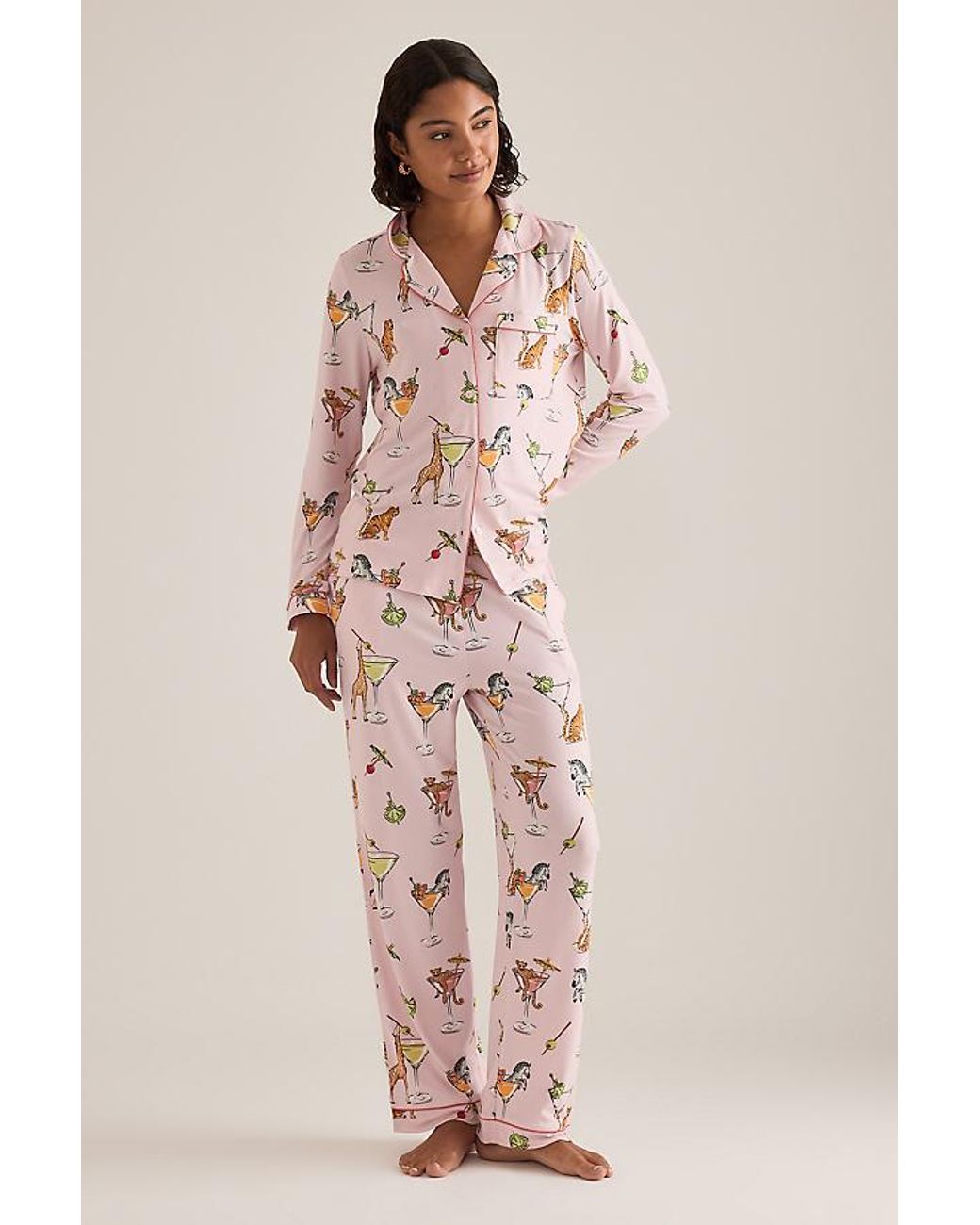Women's Pink Organic Cotton Martini Animal Print Long Pyjama Set