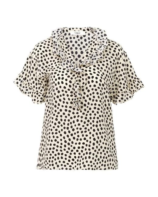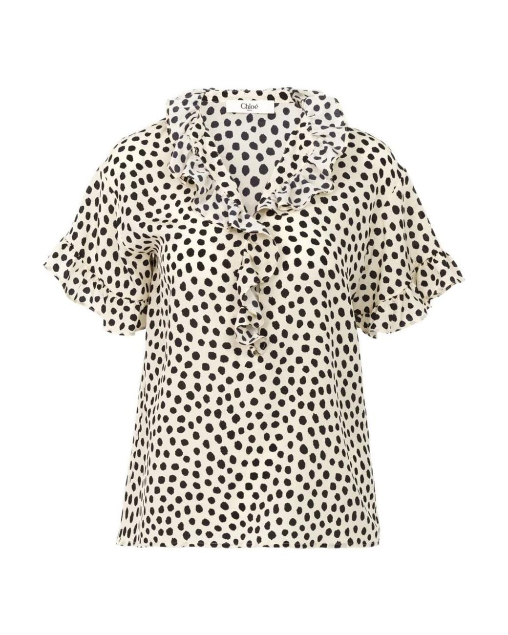 Chloé Short-sleeve Ruffle Top in silk crêpe de chine, featuring a dotted print and mother-of-pearl buttons for refined daytime styling. Key attributes: Beige | Black | Silk | Front button fastening with mother-of-pearl buttons | Short sleeves | Ruffle detail | Dotted print | Dimensions & fit: Fluid fit | Model is 178 cm (5'10") and wears size 36 | Composition & care: 100% silk | Buttons: 100% mother-of-pearl | Professional dry clean only. Do not bleach. Do not tumble dry. Do not wet clean. Iron at a maximum sole plate temperature of 110°C with gentle pressure. Colour: white
