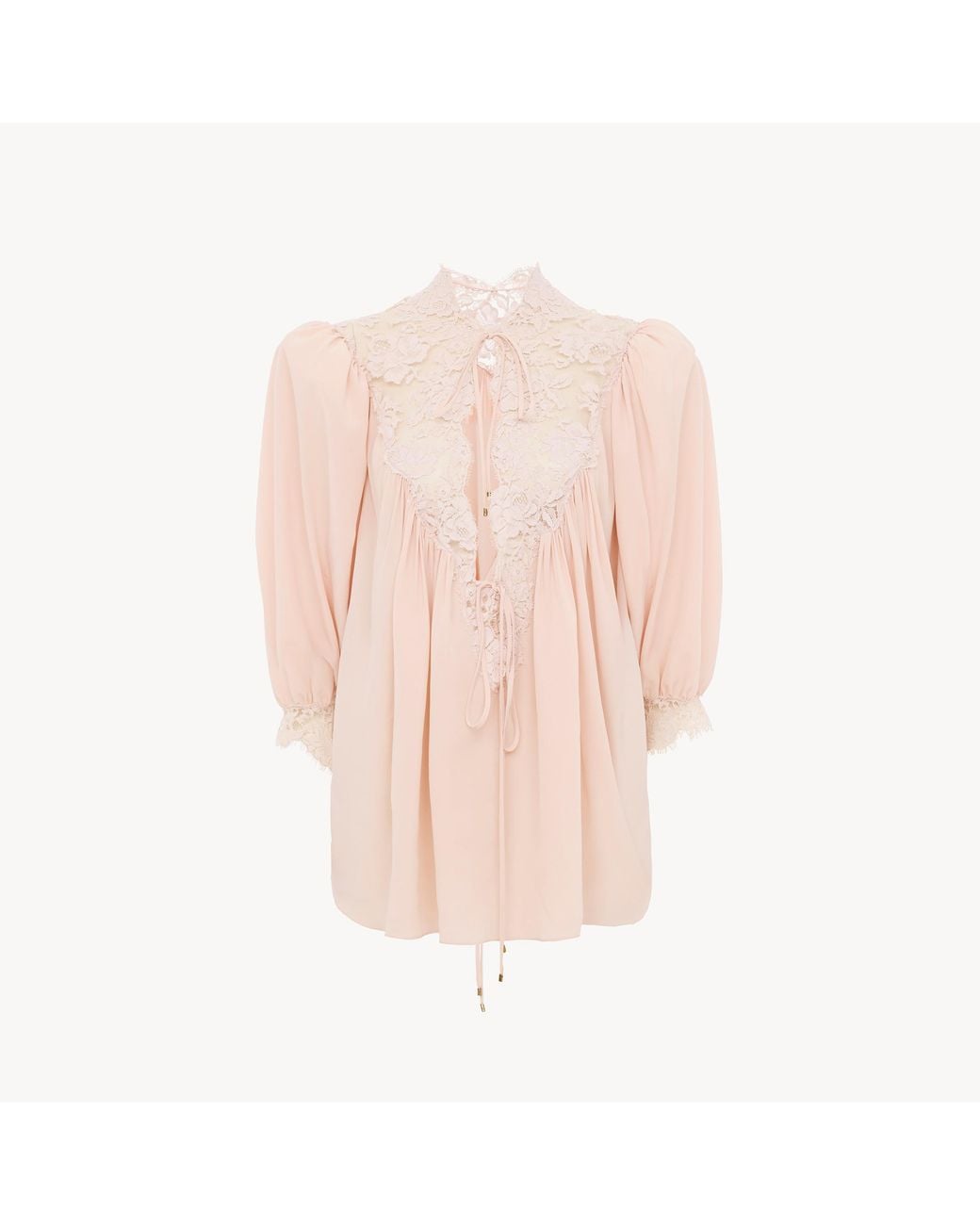 Fluid puff-sleeve top in organic silk crêpe de chine with tonal lace inserts, featuring three-quarter sleeves, dangling ties with gold-tone metal tips, and fabric-covered buttons. Colour: pink