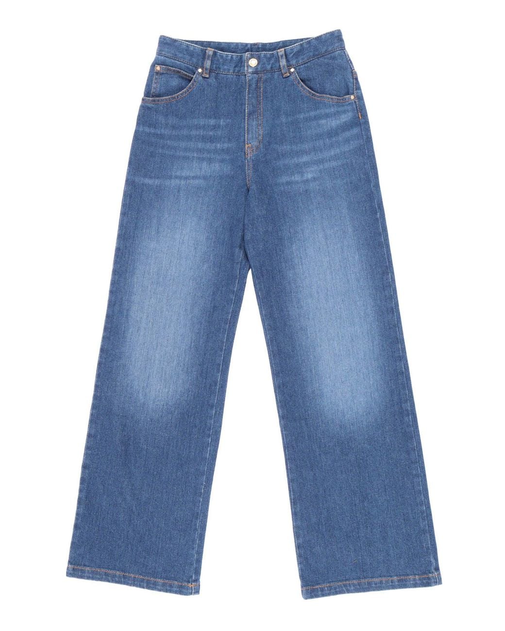 Pantaloni in denim a cinque tasche, etichetta in pelle sul retro con marchio Chlo� Paris in rilievo (pelle bovina, provenienza Italia, concia wet-white senza cromo), vita regolabile con elastico interno fino alla 12Y. Ispirato all'abbigliamento femminile. Colour: blue