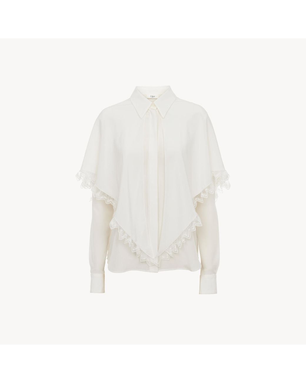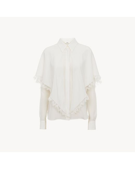 Knotted heritage cape blouse in organic crêpe de chine featuring a fluid cape with zig-zag lace trims. Colour: white