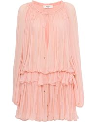Go to ChloeMini ruffled dress in semi-sheer organic silk mousseline, featuring ruffled high collar with tie detail and maxi sleeves. Mini ruffled dress outer shell: 100% Silk Separate lining: 100% Silk Care: dry cleaning only
