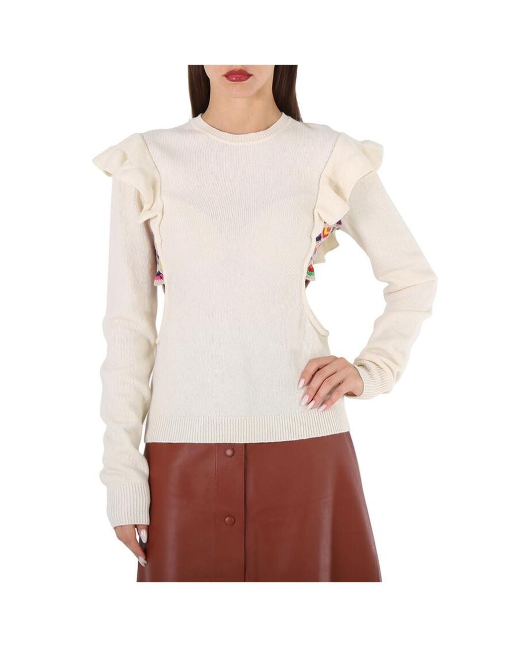 Chloe ladies tops. Fashion category: cardigans & sweaters. Chloe ladies multicolor ruffled crochet sweater. Made from a recycled cashmere and wool blend, this sweater features a crew-neck, hand-crocheted multicolor scallops, cut-outs at the sides, long sleeves, and ruffled shoulders. Wool 56%, cashmere 44%.