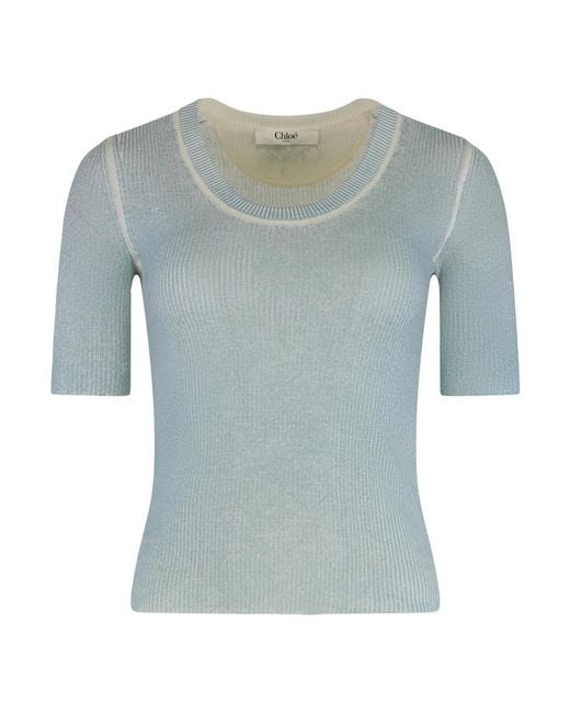 Chloé Short-sleeved Merino Pullover is a lightweight merino knit featuring a deep neckline and the Chloé logo embroidered on the back. Its simple length and silhouette make it easy to pair for spring and summer wear. Key attributes: Blue | Light blue | Merino wool | Short sleeves | Deep neckline | Embroidered logo on back | Knit construction | Solid colour | Composition & care: 65% Merinos wool | 35% Viscose Colour: grey