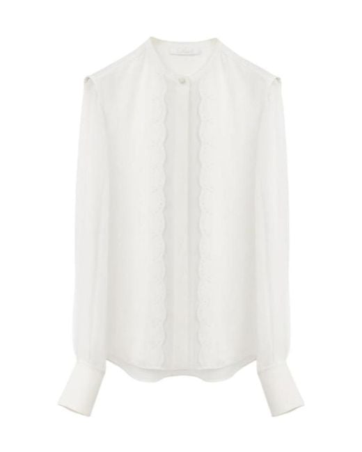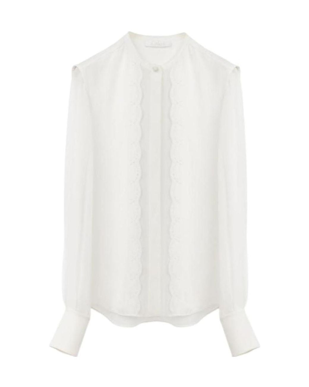 Ivory scallop embroidered tops and silk shirts feature a round neck design, with invisible buttons on the front and hand-sewn scallops on the front. Colour: white