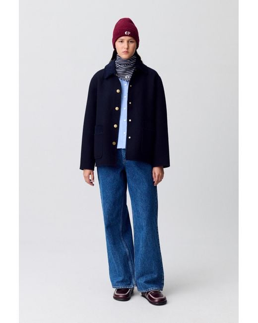 Our studio pays tribute to two female figures from the 50s and 60s - visionary architect Florence Knoll and pop culture icon Rosie the Riveter - with outfits that are both functional and sharp. Combining preppy and workwear styles, we have created hybrid outfits, such as a suit in distressed leather or a houndstooth-patterned wrap dress, with clean cuts that highlight the button detailing. Double-faced wool coat with long sleeves and a tone-on-tone velvet shirt collar - Double-faced wool coat wi Colour: blue
