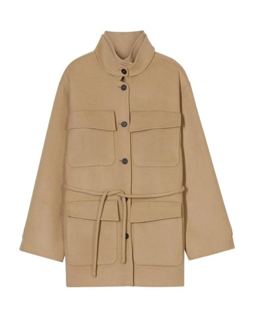 Beige button fastening patch pockets self-tie belt high neck long sleeves Size: S. Gender: Female. Material:Wool/Polyimide. Colour: natural