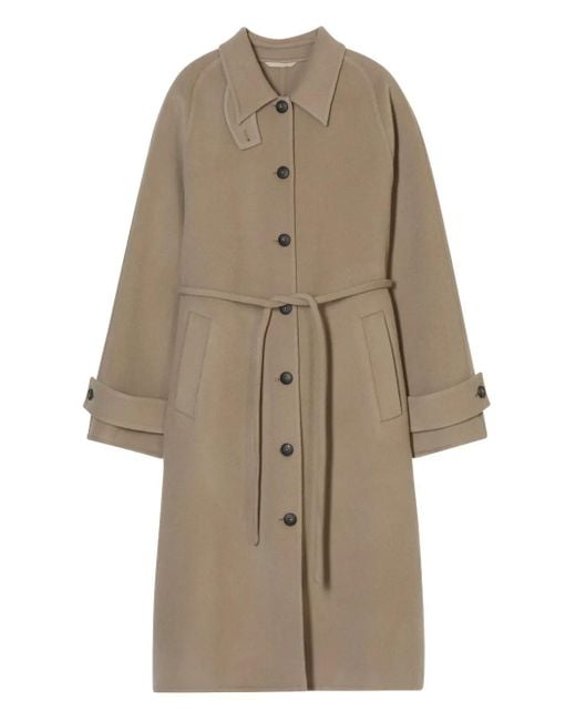 Brown button fastening self-tie belt side welt pockets belted cuffs spread collar Size: XS. Gender: Female. Material:Virgin Wool/Nylon/Cashmere.