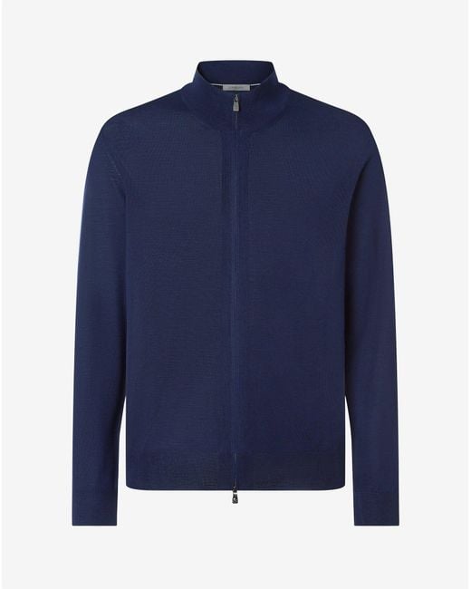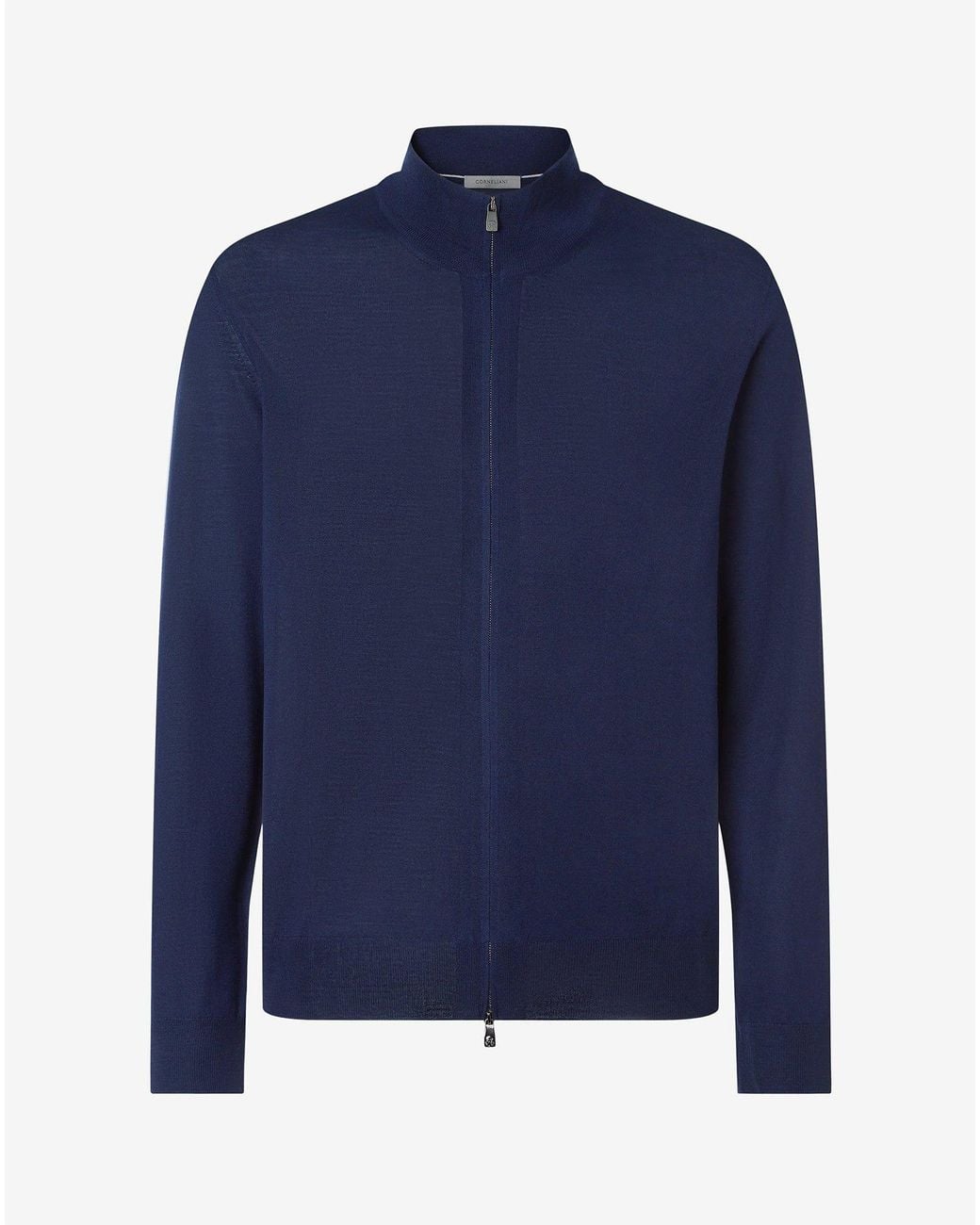 A clean design and soft feel: this blue full-zip sweatshirt made of 120's ultrafine combed merino wool is designed for superior comfort. The 18-gauge knit guarantees lightness and a neat drape, also suitable for smarter settings. A garment Made in Italy as a sophisticated alternative to the classic sweatshirt. Colour: blue